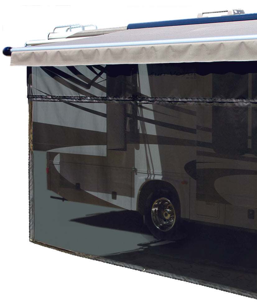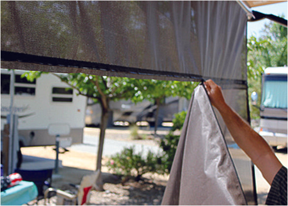 Durable Sunscreen blocks up to 85% of the sun’s heat and light to keep you cool and comfortable—in the shade. Top 1′-3′ panel slides into the utility slot of your awning and stays there for storage and travel. To use, simply zip the large bottom panel to the top panel with ease. Choose 10′-19′ length with 6′-11′ drop. Grommets and ground stakes are included. Choose Black, Brown, Tan or Grey. 5 Year Warranty.